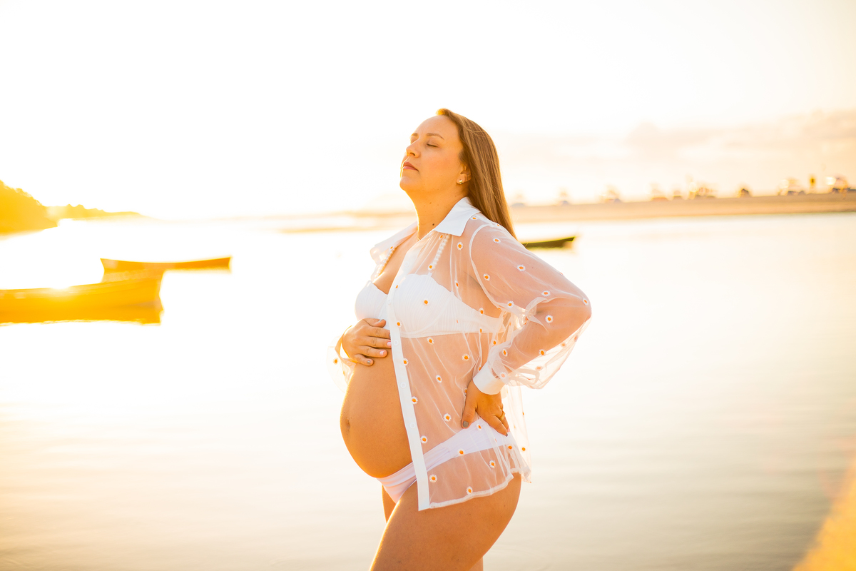 Escolher o nascer do sol na Guarda nos permitiu capturar essa luz 'mágica' e quente, com a exclusividade de ter a praia e as icônicas canoas só para nós. A mamãe na espera da Alana brilhou tanto quanto o sol, em uma sessão leve, fluida e cheia de significado. Se você busca um ensaio que transmita serenidade e conexão profunda, a Guarda ao amanhecer é o cenário ideal.